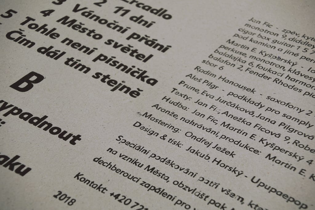 Obal na LP je ručně vytištěný na strojní lepence. Titulní strana je tištěná na sucho bez barvy a následně ručně oválena válečkem s tiskařskou barvou. Každý kus LP je tak originál s různě sytou a velkou titulní grafikou dosyta naplňující přání vzniku patiny špíny města. Zadní strana tištěná knihtiskem.