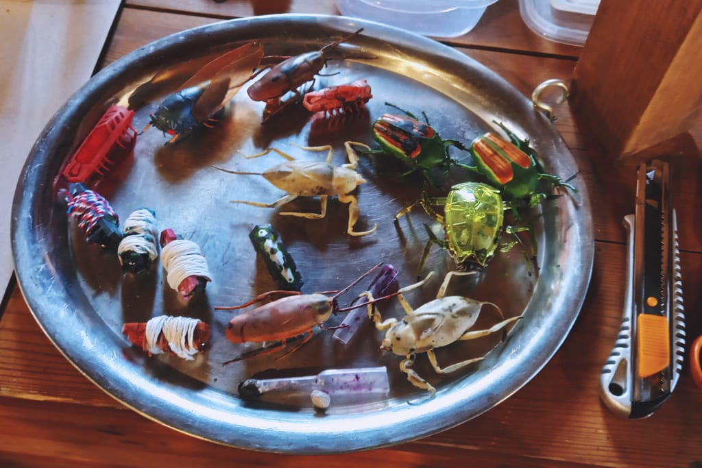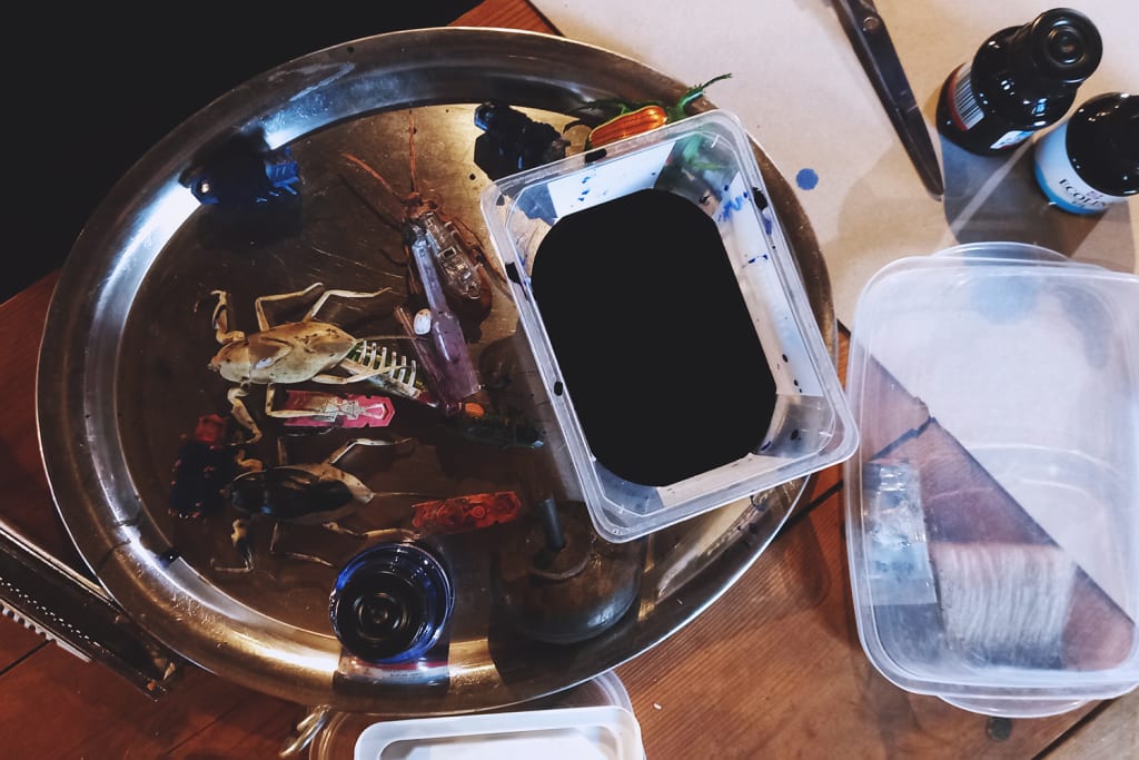 Eight songs recorded in Petr Nikl’s apartment between the living room and the kitchen, packed in a cardboard envelope, which is still unfinished in its original form. Covers take their final form during concerts, which are interspersed with live performance. During them, Petr Nikl, accompanied by improvising musicians, lets robotic beetles dipped in ink run over the packaging and thereby complete their form. Each piece is thus unrepeatable and becomes an author’s graphic at the same time.