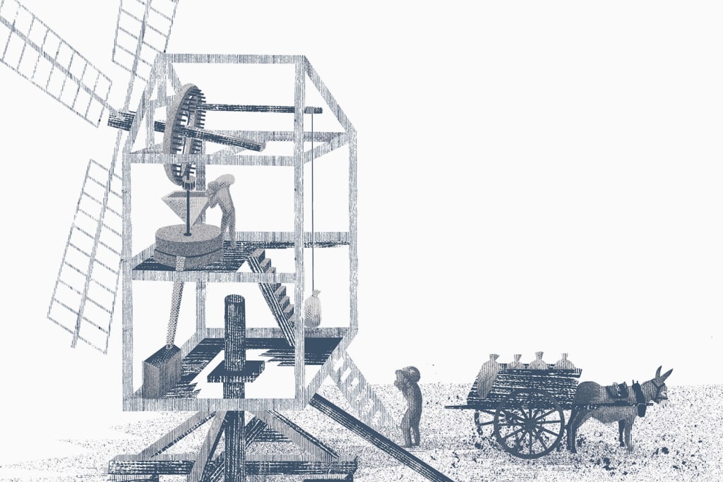 Illustration and graphic design of the book. A story about searching for oneself and finding treasure under one’s own doorstep, framed by an explanation of windmills.