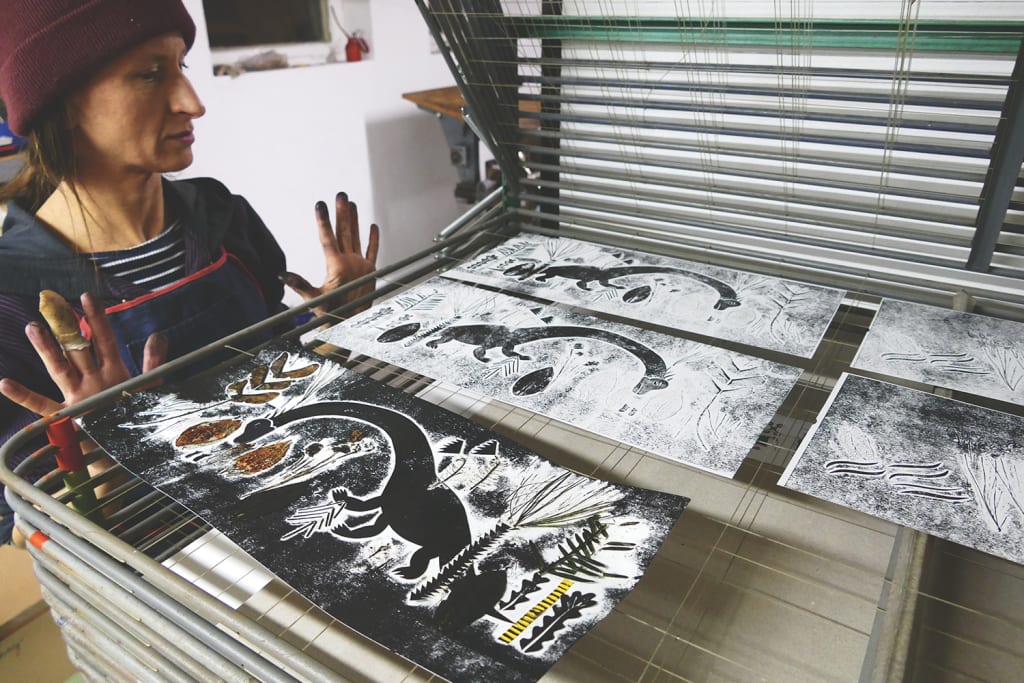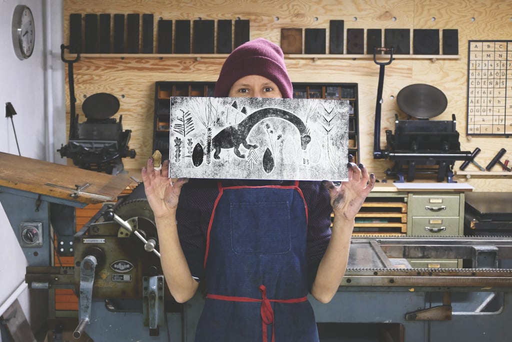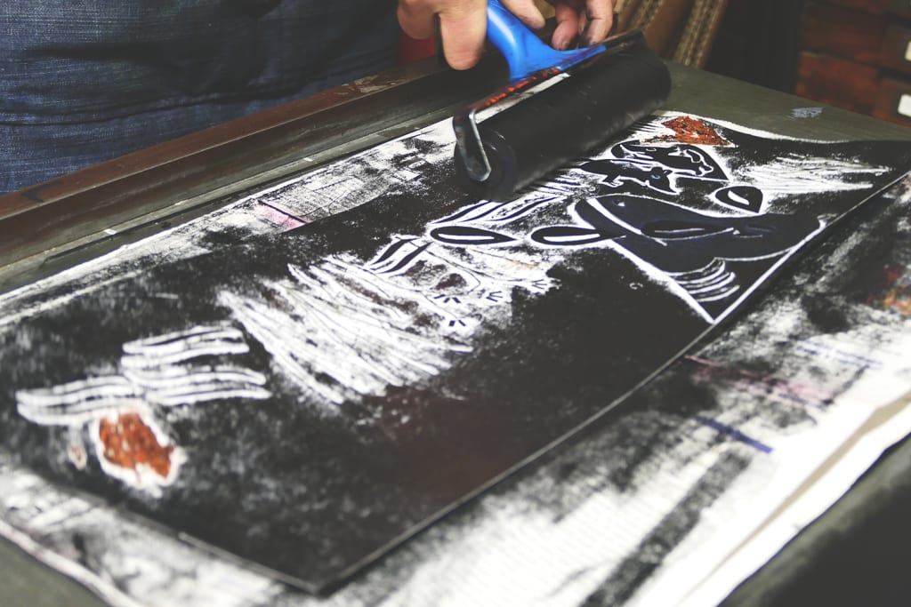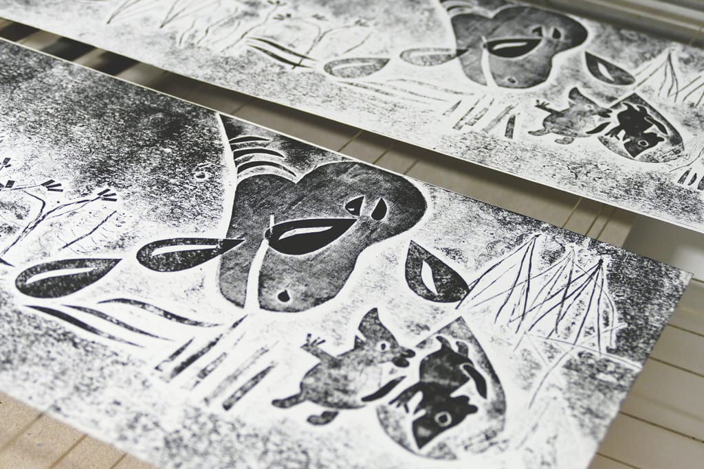 Illustrations are created with colored paper prints and material prints. A technique where the printing matrix is created by layering papers and materials of different structures, which are then printed on the paper.